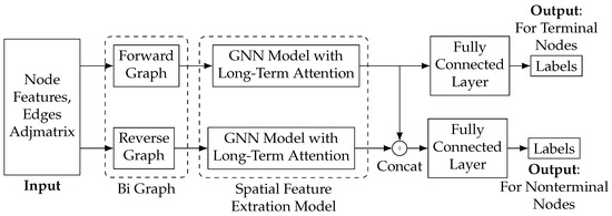 To analyze the transaction graph, we constructed the forward graph and the reverse graph . The node features X along with the adjacency matrices and of and are separately inputted into distinct spatial feature extraction modules. Consequently, we obtained the node embeddings and for each node within and , respectively.
