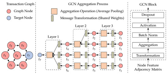 With the publication of the graph convolution network (GCN) by Kipf et al. [26], more and more researchers began using graph neural networks to study anti-money laundering on blockchain. There are many types of GCNs and their variants, and since the transaction network is a directed graph, it is more suitable to adopt spatial-domain GCN algorithms [27]. The GCNs mentioned later in this paper are all spatial-domain GCNs. The simplest spatial-domain GCN replaces the symmetric normalized Laplacian matrix with random walk normalization when aggregating information. Other common examples are the graph attention network (GAT) [28] and graph sample and aggregate (GraphSAGE) [29]. Among these, GAT adds a self-attention mechanism when the network aggregates neighbor information, while GraphSAGE samples neighbor nodes before applying the aggregation function.