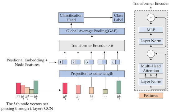 We applied a global average pooling (GAP) operation to the vectors obtained after the encoder. Equation (10) computes the result vector of node . All node result vectors are then taken as input to the classification head.