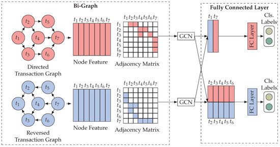 - Bi-Graph: To address the limitation of the GCN in capturing the money laundering structure due to the absence of loops in the blockchain transaction graph, we adopted a bi-graph module. This module creates a reverse graph from the forward graph, allowing the model to learn the characteristics of both the source and destination of transaction funds.