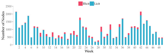 We adjusted the hyper-parameters of the LB-GLAT model empirically. Table 1 shows the parameters. For the Elliptic dataset, we removed the timestamp feature and used only the remaining 165 node features. The data for each time step were divided into training (80%), validation (10%), and test (10%) sets. However, the positive and negative samples were severely unbalanced in each time step, as shown in Figure 6. To balance the samples, we adopted the under-sampling approach so that the ratio of illicit to licit samples was 1 to 5. The nodes for each time step were fed into the model as a batch, and the unused data were masked. The training super-parameters are shown in Table 1.