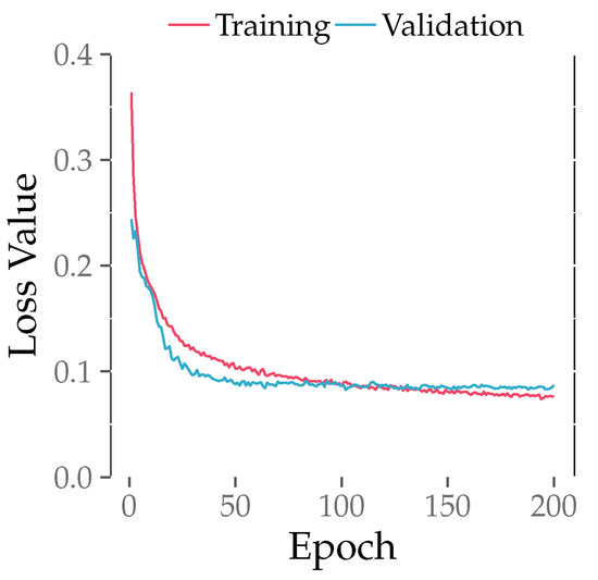 We conducted a training process for LB-GLAT and observed the loss of both the training set and validation set. The results are shown in Figure 7. The training loss represents the mean loss value after training for each batch, while the validation loss indicates the loss after training for each epoch. Notably, during the early stage, the validation loss was smaller than the training loss. In Figure 7, the training loss decreased as the number of epochs increased, indicating the convergence and correctness of our model. Similarly, the validation loss decreased initially with the increase in epoch count and later stabilized. Continuing training beyond this point only yielded limited improvement in model performance. Therefore, we set the epoch count to 200 and tested the model on the test set when the validation loss was at its lowest point.