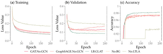 Figure 8a shows the comparative results of the training losses for the ablation experiment. All training loss curves declined rapidly in the early stage and flattened out in the later stage. Among them, the training loss curves of LB-GLAT and GraphSAGE decreased the fastest, but in the validation loss comparison of Figure 8b, GraphSAGE quickly presented over-fitting, while the LB-GLAT validation loss curves decreased until flattening, to a lesser extent than GraphSAGE, presenting the best results in these ablation experiments. Moreover, as shown in Figure 8c, LB-GLAT had the highest accuracy, reaching about 0.98. We used an early stop strategy and selected the model with minimal validation loss to test the five evaluation indicators on the test set. The results are shown in Table 2. We underlined the highest value of each evaluation indicator. LB-GLAT achieved the best experimental results on all indicators, with reaching 0.9776, reaching 0.9317, reaching 0.8494, reaching 0.8887, and reaching 0.9806.