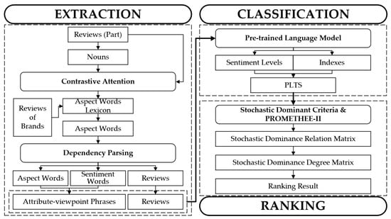 Figure 1. First, the attribute–viewpoint phrases are extracted by Contrastive Attention and Dependency Parsing. Then, based on the evaluation index system, the sentiment levels and indexes of reviews are classified using the phrases. Finally, according to PLTS formed by the classification results, the indexes are ranked using stochastic dominance criteria and PROMETHEE-II.