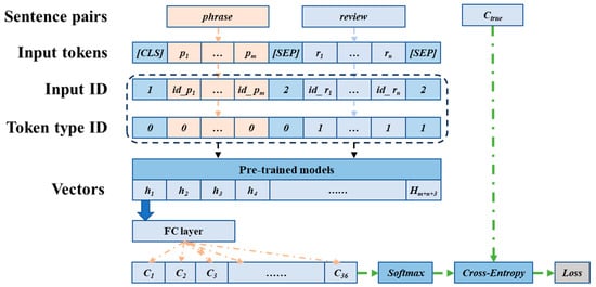 In the training phase, a tuple (phrase, review) is given, and a token sequence is constructed in a form similar to “[CLS], p1, ···, pm, [SEP], r1, ···, rn, [SEP]”, where p1, ···, pm are words that form a phrase, and r1, ···, rn are words that form a review. Moreover, [CLS] and [SEP] are special tokens in the pre-trained models. The token sequence is subsequently input into the pre-trained models, and the vector of [CLS] h1 is used for classification via an FC layer.
