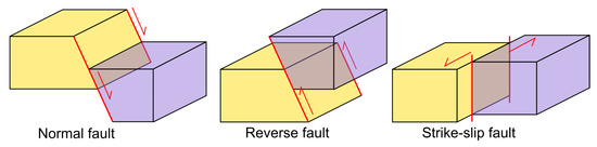 According to modern concepts, a tectonic earthquake source occurs as a result of sliding along the inner surface—the fault plane [19]. There are three types of faults: normal, reverse and strike-slip (Figure 1). Strike-slip faults are associated with dominantly horizontal displacement, and normal and reverse faults with vertical displacement.