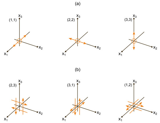 where is a dislocation in the j-th direction across the fault surface , and is the direction cosines of the normal to the surface element . If , then are strain nuclei corresponding to double forces without moment (Figure 2a), and is the strain nuclei combination corresponding to the dilation center. If , then are strain nuclei corresponding to two perpendicular pairs of double forces with moments (Figure 2b). Figure 2 shows the systems of forces corresponding to strain nuclei combinations .