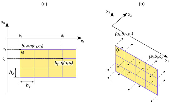 - We build a two-dimensional grid on the plane with horizontal and vertical steps and , respectively (Figure 4a).