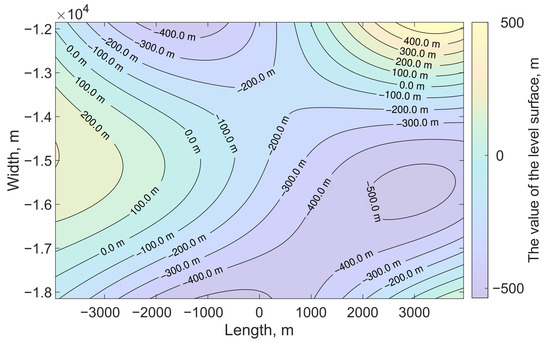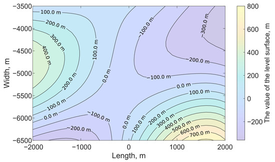 The strike-slip fault surface was located at the depth of m, its linear dimensions were m, m, and the displacement value was assumed to be constant and equal to 0.8 m. Angles of orientation in space for the fault surface were chosen as follows: the dip angle equal to 90°, the slip angle equal to 0°. On the free surface , the calculation was performed on a two-dimensional grid km with a step equal to 500 m. The random values defining stochastic fault surface are presented in Table A1. These values are normally distributed with the mean equal to 0 m and standard deviation equal to 350 m. The isolines of the stochastic fault surface are shown in Figure 5.