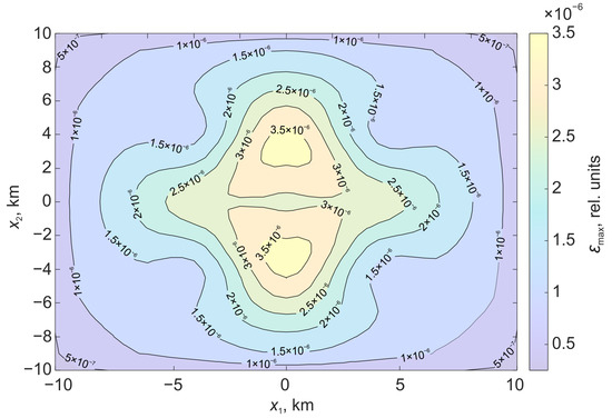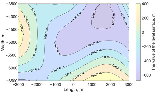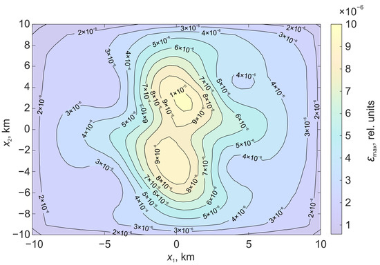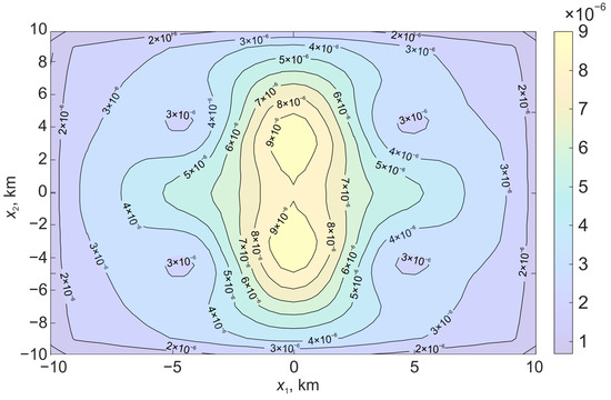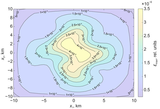 As an example, we consider the distribution of relative deformation areas caused by the displacement value equal to 0.76 m along the km strike-slip fault surface located at the depth of 15 km. Such dimensions correspond to an earthquake with a moment magnitude of approximately [27]. The isolines of the stochastic fault surface are shown in Figure 13. Values , which define the surface, are presented in Table A3.