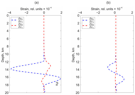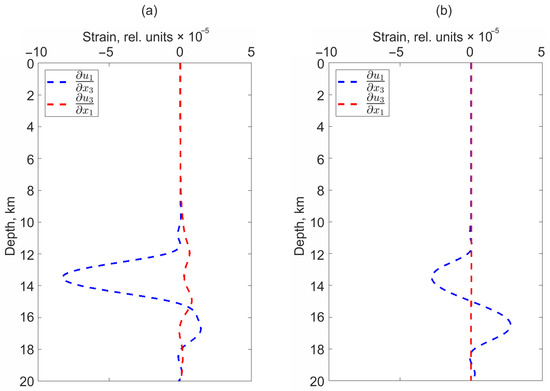 In addition, there are pronounced changes in the derivatives variations of the displacement field with a change in depth. For example, Figure 8 shows variations at depths up to 20 km ( m, m, varies from 0 to −20,000 m).