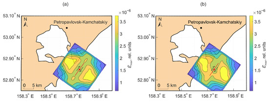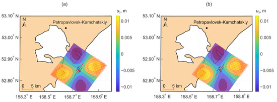 Figure 14 shows a fragment of the Kamchatka Peninsula. This is one of the most seismically active regions of the planet. Most Kamchatka earthquakes occur at a distance of 30–150 km from the eastern coast of the peninsula, in the subduction zone adjacent to the Kuril–Kamchatka Trench [28]. Let us assume that the epicenter of this hypothetical earthquake was located near the peninsula in the subduction zone (the epicenter coordinates are 52.85° N, 158.75° E; red dots in Figure 14 and Figure 15). The angles characterizing fault surface were chosen as follows: dip angle equal to 90°, strike angle equal to 0°, and slip angle equal to 125°. The slip angle corresponds to the main direction of the tectonic stresses action near the coast of Southern Kamchatka [29]. It can be seen from Figure 14b that the spatial distribution of deformations in the case of a stochastic fault surface differs significantly on the Earth’s surface. Figure 15 shows the displacement field caused by the hypothetical earthquake.