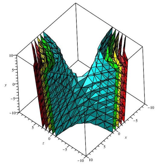 With the previous notations, consider the temperature derivative of the pressure (also known as the thermal pressure coefficient [56]) and the heat (also known as thermal) capacity, i.e., the speed of the free energy w.r.t. T. (The notation for the heat capacity is not the usual one !) We can use Formula (6) in order to express the entropy as a function of , , and the volume, i.e., . Consider coordinates on an open subset of . The entropy function on defines a (regular, Monge-type, 3D) hypersurface in . The image of this parameterized hypersurface is a hyperquadric , namely a special hypercylinder in . In Figure 1, one sees how the level sets of S foliate .