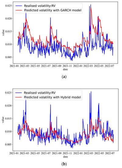 Out-of-sample prediction of RV with different models: (a) results of GARCH models; (b) results of hybrid model.