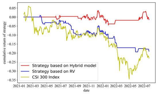 We utilize a hitting series function to transform the predicted VaR values into binary signals, where a signal of 1 indicates a potential loss of less than 20% and prompts a long position in the CSI300 Index, while a signal of 0 suggests selling positions to hold cash only. Based on this approach, we develop a trading strategy and evaluate its performance using a holdout method. As displayed in Table 4, under a 99% confidence level and leveraging the volatility predictions of our hybrid model, we achieve a cumulative return of −0.0142, outperforming the returns of −0.1898 and −0.228 obtained using RV and CSI300 alone. Similarly, under a 90% confidence level, our hybrid model yields a cumulative return of −0.2075, surpassing the returns of −0.2494 and −0.228 derived from RV and CSI300. Notably, the strategy was tested using out-of-sample data, demonstrating the significant improvement in performance offered by our hybrid model compared to the simple trading strategy.
