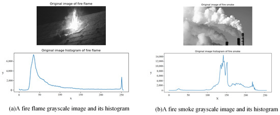 Dynamic threshold grayscale segmentation determines the threshold of image binary segmentation. It maximizes the inter-class variance between foreground and background images after binary segmentation of the image. It is considered the best algorithm for adaptive threshold selection in image segmentation. It uses simple calculations and is not affected by image brightness and contrast, making it widely used in digital image processing. It divides the image into background and foreground based on its grayscale characteristics [52]. Since variance is a measure of the uniformity of grayscale distribution, the larger the inter-class variance between the background and foreground, the greater the difference between the two parts of the image. When part of the foreground is wrongly divided into the background, or vice versa, the difference between them will decrease. Therefore, the segmentation that maximizes the variance between classes results in a minimal probability of misclassification. However, it is sensitive to image noise for single-target segmentation when the proportions of target and background are very different, and the variance function between classes may have two or more peaks. The characteristics of fire smoke and flames are static or dynamic. Some physical phenomena, such as luminescence and heating, will be generated during fire combustion, which makes the flame show characteristics such as color and texture. The color feature of a flame image is often more obvious than the texture feature. The dynamic changes of fire smoke and flames mainly include area and contour changes. Therefore, their histograms often show two or more peaks. Figure 2a shows an original image of a fire flame in grayscale and its histogram. Figure 2b shows a fire smoke grayscale image and its histogram. From these, it can be seen that the histograms of both fire smoke and flame images show characteristics of two or more peaks; therefore, these images are suitable for preprocessing with dynamic threshold grayscale segmentation algorithms.