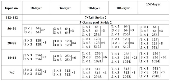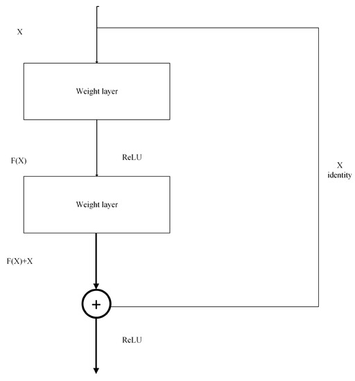 Residual Net (ResNet) is a convolutional neural network that won the image classification and object recognition award in the ImageNet Large Scale Visual Recognition Challenge (ILSVRC) in 2015. This method is very easy to optimize and can improve accuracy by increasing depth. The remaining blocks within it adopt skip connections, alleviating the problem of gradient disappearance caused by depth increase. Figure 3 shows the architectures of ResNet18, ResNet34, ResNet50, ResNet101, and ResNet152. The expression ability of ResNet will improve with the increasing depth and width of the network. Degradation of the network is not an issue. Better performance can be achieved with sufficient training data and a gradually deepening network. Figure 4 shows the residual function. The block formed by is called a residual block [53]. The remaining cells can be implemented in the form of skip layer connections, where the inputs of the cells are directly added to the outputs of the cells and then activated.