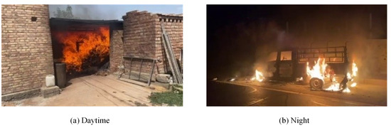 The video-based FID dataset consists of video monitoring data from the fire department. Figure 10 shows parts of a video-based fire with 568 × 320 resolution. Figure 10a,b show a fire monitoring video at daytime and night, respectively.