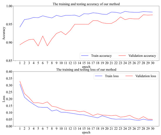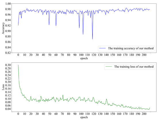 Figure 14 shows the results of hyper-parameter studies on the number of iterations of our method. With 15 iterations, the accuracy of our method can reach 98.20%. With 193 iterations, the training loss can be reduced to 0.0384. In terms of accuracy, with fewer than 15 iterations, our method is in a state of underfitting, and its accuracy increases with the number of iterations. With greater than 15 iterations, the accuracy will not increase further and reaches the saturation state. In terms of training loss, when the number of iterations is less than 193, our method is in a state of underfitting and its loss decreases with increasing iterations. With 193 iterations, with increasing iterations, the training loss of our method will no longer decrease and reaches the saturation state. Therefore, the best number of iterations is 193.