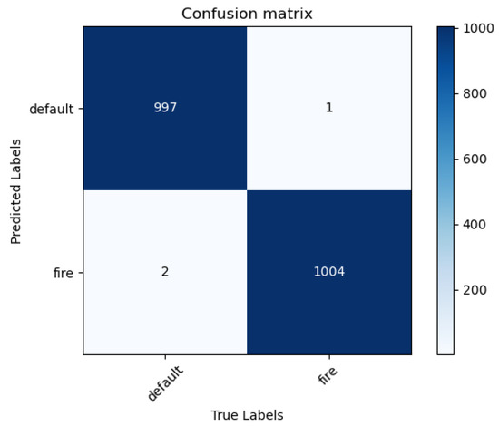 We calculated the test confusion matrix of our model, as shown in Figure 12, from which we can see that for 999 default images and 1005 fire test images, our method identified 998 default images and 1004 fire images. Hence, the comprehensive false-alarm rate of our method is less than 0.1% (0.098%).