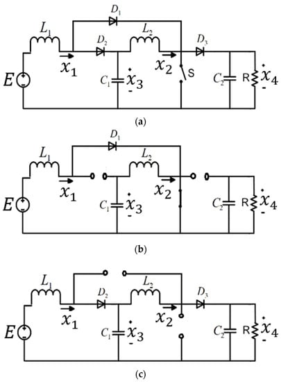 ‘Mode 1’: In this mode, diodes and are biased in the reverse direction while is forward biased. Also, the semiconductor device ‘S’ is closed while the device is working in this first condition. Energy is stored in the two inductors, and , by the input voltage sources and , respectively. The derivative expressions for this mode of operation can be obtained by employing Kirchhoff’s laws of voltage and current (KVL and KCL) in Figure 1b, and as a result we obtain (see Appendix A for detailed derivation):