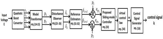 A sliding-mode (SM) scheme is another well-employed scheme that is suitable for dc–dc converters [16,17,18,19,20,21,22,23,24]. Traditionally, hysteresis-modulation is used for the implementation of the SM controller for dc–dc converters [6,20,21,22]. This method has recently been used to regulate the output voltage of several high-gain converters like the quadratic boost converter [6,20], the hybrid boost converter [21], and the zeta converter [22]. Although this method is easy to implement, its main drawback is that it may lead to chattering in the response. Also, since the switching frequency is not fixed, there could be large variations in the switching frequency in the presence of load and line variations. This may lead to increased switching losses and electromagnetic interference (EMI) issues. To address these concerns, recently, the constant-frequency SM scheme has been employed for high-order boost converters like the quadratic boost converter in [16]. In this method, the pulse-width-modulation (PWM) technique is used to generate the control signal. The various advantages offered by this method are ease of implementation, reduced chattering, and lower electromagnetic interference (EMI) issues. Some of the other state-of-the-art SM controllers for dc–dc converters based on the PWM approach are discussed in [17,18]. As can be seen, there has been considerable efforts made towards the implementation of several non-linear controllers for high-order dc–dc converters. However, the main drawback of most of these controllers is that their stability is guaranteed only in the neighborhood of the equilibrium point. In other words, they guarantee only small-signal stability and none of the works discussed so far address the large-signal stability of the controlled high-step-up power converters. Thus, to ensure smooth tracking in the presence of large and fast variations in the system parameters, the problem of the design of a robust and globally stable controller for high-step-up dc–dc converters still needs to be addressed.