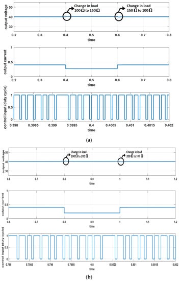 Initially, the effect of load disturbances on the output response was investigated. Figure 3a shows the system’s response when the load was varied by 50% from to at time t = 0.4 s, and then back to at t = 0.6 s. The response in Figure 3a includes the response of the output voltage, the load current change, and a zoomed version of the control signal. It can be observed that the output quickly reached the reference voltage. The response has an overshoot of ~1% and settling time of ~0.01 s. The ability of the converter to handle heavy load disturbances was also investigated and, to this end, the load was changed from 100% of its nominal value. Figure 3b shows the system’s response when the load was varied by 100% from to at time t = 0.8 s, and then back to at t = 1 s. Again, the output settled to its reference value with an overshoot of only ~1.2% and a settling time of ~0.02 s.