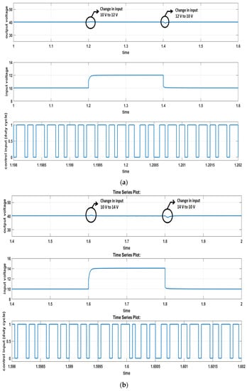 Next, the ability of the closed-loop system to handle the input voltage variations was verified. First, the input battery voltage was changed by 20% from to at t = 1.2 s, and then back to at t = 1.4 s. Figure 4a shows the converter’s response and the corresponding input voltage and control signal variables. Next, the supply was changed by 50% from to at t = 1.6 s and then back to at t = 1.8 s. The response is depicted in Figure 4b. As can be observed, the response settles to its nominal value in ~0.02 s.