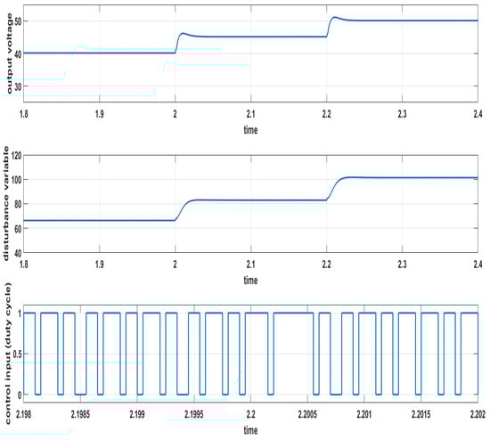 Lastly, the capacity of the propsoed SM-controlled system to handle reference voltage variations was investigated. Figure 5 shows the converter’s response, including the output voltage, disturbance variable, and control signal variables when the reference volatge was changed from to at t = 2 s and then at t = 2.2 s. All of these results verify the converter’s ability to tightly regulate the output voltage to its reference value.