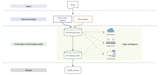 There is an increasing amount of research on edge intelligence. Edge intelligence technologies are maturing and being applied in a wide range of scenarios. Zhao et al. [21] proposes a model of IoT encrypted flow detection based on edge intelligence, which reduces the time for establishing the model. Zeb et al. [22] proposes a new edge-native framework for intelligently predicting data traffic, and Mohammed et al. [23] also introduces the concept of edge intelligence when classifying IoT traffic. From the above, when edge intelligence is combined with malicious traffic classification of the IIoT, it can also improve the training efficiency of the classification model and reduce the probability of privacy leakage. Qi et al. [24] proposes a blockchain-driven traffic classification method for edge computing in addressing normal traffic classification for IIoT, which effectively reduces time overhead and memory usage. In addition, edge intelligence can also reduce bandwidth requirements, enhance offline functionality, improve system reliability, and save network costs. These advantages can provide technical support for industrial IoT security.
