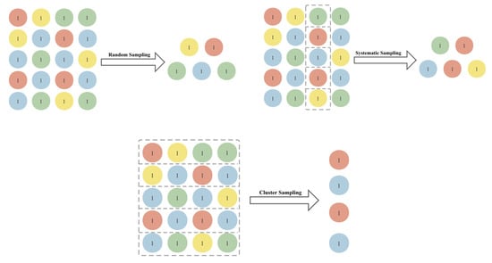 Since the traffic density is very high in real scenarios, it is necessary to sample the data. Data sampling can not only save computational resources and accelerate model training but also balance the bias and variance of the model, improving its generalization ability while maintaining data representativeness. Among various sampling methods, we selected three sampling methods that are feasible in practical applications to compare the effects, namely random sampling, systematic sampling, and clustered sampling. Random sampling means the traffic packets are sampled with equal probability. Systematic sampling means that the first traffic packet is selected randomly and that the other traffic packets are selected using a fixed sampling interval. Cluster sampling means we use the sub-packet groups of the overall traffic packet as the sampling unit, and the whole traffic packet is divided into several sub-packet groups, called clusters; then, a complete cluster is randomly selected as the sampling sample. The pattern diagrams of the three sampling methods are shown in Figure 2.