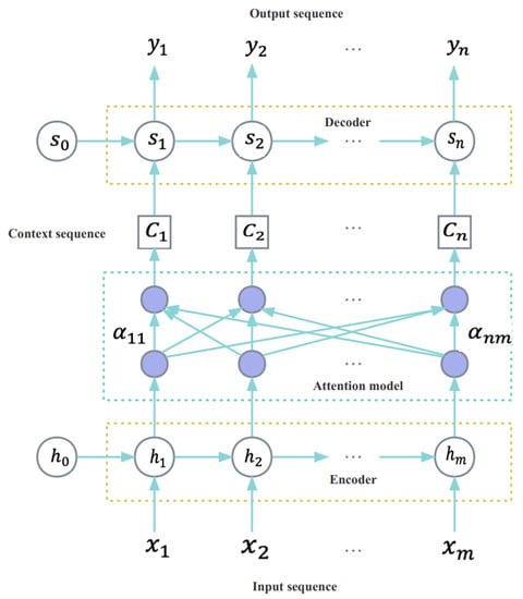 In the encoder–decoder architecture [31] of the Seq2Seq model, given an input sequence with length m, the model generates a target sequence with length n. Figure 3 illustrates this architecture, where the encoder hidden states: , the decoder hidden states: , the contextual sequence .