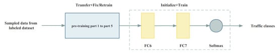 The weights learned by the pre-trained model are transferred to the retrained model, which is then retrained with a small, labeled dataset and finally decoded for classification. Since many traffic patterns have been observed as part of the pre-trained model, adding a small amount of manually labeled data during re-training can accomplish a fast classification task that makes re-training converge faster.
