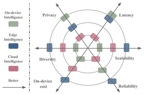As shown in Figure 7, the advantage of edge intelligence is that diversity, scalability, reliability, and latency are better. Meanwhile, privacy can be protected; however, although cloud-side execution has strong computational power, the data transmission process increases the transmission latency and raises the risk of privacy leakage. For local device-side execution, although the data transmission process is reduced, which reduces the transmission latency and risk of privacy leakage, the computational power is insufficient and adds considerable computation time. Edge intelligence combines the advantages of cloud and local, which can better serve the model.