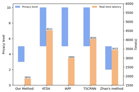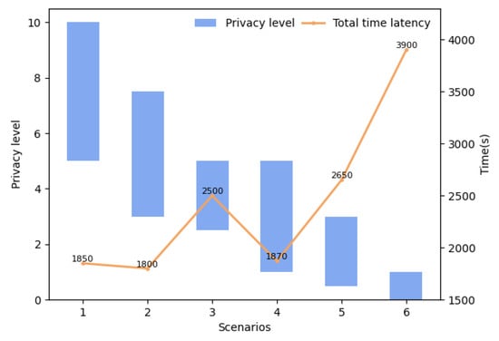 The definitions of total latency and privacy level are given in 3.4. Figure 8, shows that these six scenarios have advantages and disadvantages in terms of total latency and privacy-protection issues. The total latency of scenarios 1, 2, and 4 is lower and not much different, and the threshold of privacy level is set to 5. When the privacy level is lower than 5, privacy confidentiality is better, and the possibility of privacy leakage is lower. Therefore, scenarios 2–6 have a lower likelihood of privacy leakage.