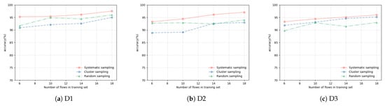 As depicted in Figure 9, the final accuracy for the three datasets tends to stabilize around 97% as the number of training samples increases when utilizing systematic sampling. Among the datasets, D1 achieves the highest classification accuracy of 97.55%. The other two sampling methods do not learn the traffic pattern comprehensively when the training set is small, resulting in low classification accuracy. However, with the increase in the training set, the accuracy of D1 and D3 increased more obviously, and the increase in D2 was less significant because the distribution of key information in D2 was more concentrated. In summary, our model can determine the use of systematic sampling.