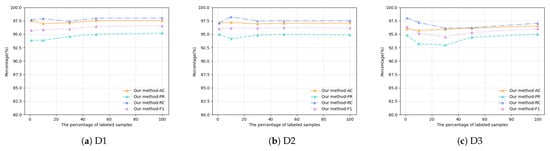 Figure 10 displays the results of experiments that were conducted on three datasets using systematic sampling and altering the number of labeled samples. The four evaluation metrics (AC, PR, RC, and F1) are shown to be stable at high levels regardless of the percentage of labeled samples, which suggests that our technique has some degree of generalizability. Specifically, at a labeled sample proportion of 1%, D1 and D3 demonstrate the highest classification accuracy, while at a labeled sample proportion of 5%, D2 exhibits the highest classification accuracy.