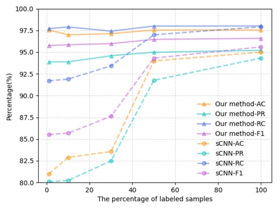 For the identical dataset, we compare our method with the fully supervised CNN (sCNN) for malicious traffic classification. In scenarios with a low proportion of labeled samples, our method achieves high levels of accuracy (AC), precision (PR), recall (RC), and F1 score. As the proportion of labeled samples continues to increase, the accuracy of the fully supervised CNN approaches that of our method. Figure 11 illustrates the trend of the four evaluation metrics as the proportion of labeled samples increases.
