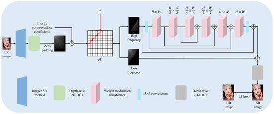 First, the high-frequency DCT domains are embedded into low-level features using a 3 × 3 convolution. The embedded low-level feature is input into a modulation transformer block as an encoder-decoder. Second, the input low-level features are subjected to downsampling and upsampling. The upsampling and downsampling methods are the pixel-shuffle and pixel-unshuffle, respectively. In addition, skip connections are used to restore high-frequency components. The downsampling and upsampling processes with skip connections preserve the fine structural characteristics of restored high-frequency DCT detail components. Furthermore, the original high-frequency DCT components are added to the restored high-frequency component resulting from the last 3 × 3 convolution layer. Finally, the restored high-frequency component is combined with a low-frequency component and is transformed into the spatial domain using the depthwise 2D inverse DCT (IDCT). The integer-scale SR is frozen, and the transformed spatial domain image trains the network with L1 loss with the SR image and ground truth (GT) image. In summary, the main points of m-DCTformer are as follows: