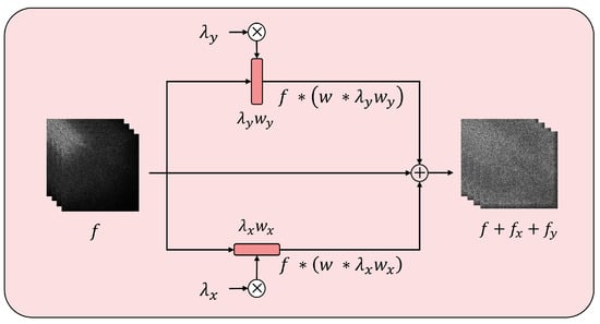 where * denotes a convolution operation. Each weight starts at the maximum scale factor , and modulates to the target arbitrary-scale factor , . Figure 4 depicts the process of the weight-modulation layer. We designed them separately as 3 × 1 and 1 × 3 convolution layers to process in each horizontal and vertical direction, respectively. Each layer trains independently at the minimum arbitrary-scale factors of and . Therefore, we modulate the weights w with coefficients and according to the target arbitrary-scale factor. The modulated feature f and the coefficient and to use weight modulation can be expressed as follows: