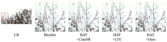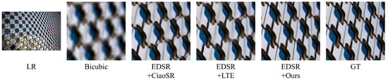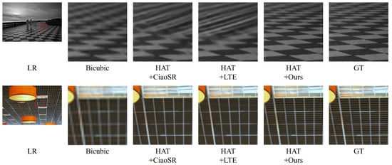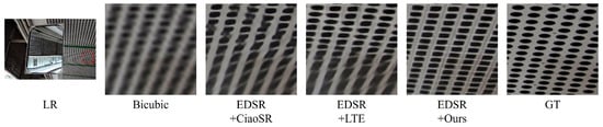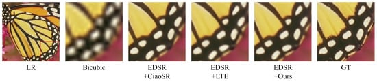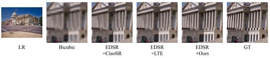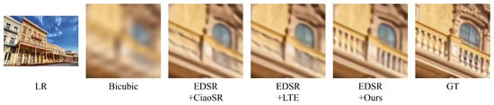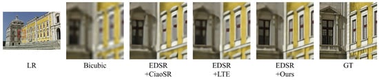 This section compares the performance of the proposed m-DCTformer with the state-of-the-art arbitrary-scale SR methods CiaoSR and LTE. Each arbitrary-scale method is trained on the LR bicubic DIV2K dataset. For the proposed model, we only trained with LR datasets with scale factors of ×2.1 and ×4.9, whereas for the other models, we used scale factors of ×2, ×3, and ×4. We also evaluated the proposed model quantitatively using the PSNR and SSIM. Table 1, Table 2 and Table 3 show the quantitative results with other approaches and our m-DCTformer. Moreover, they use EDSR and HAT in integer SR, and they are obtained from Set5, Set14, and Urban100 datasets. Table 1 shows our EDSR + m-DCTformer outperforms EDSR + CiaoSR by an average of 0.23 dB and 0.0462 dB and outperforms EDSR + LTE by an average of 0.17 dB and 0.0045 dB in terms of PSNR and SSIM, respectively. Our HAT + m-DCTformer outperforms HAT + CiaoSR by an average of 0.71 dB and 0.0116 dB and outperforms HAT + LTE by an average of 0.43 dB and 0.0076 dB in terms of PSNR and SSIM, respectively. Table 2 shows our EDSR + m-DCTformer outperforms EDSR + CiaoSR by an average of 0.15 dB and 0.0449 dB and outperforms EDSR + LTE by an average of 0.1 dB and 0.0037 dB in terms of PSNR and SSIM, respectively. Our HAT + m-DCTformer outperforms HAT + CiaoSR by an average of 0.24 dB and 0.0043 dB and outperforms HAT + LTE by an average of 0.51 dB and 0.0098 dB in terms of PSNR and SSIM, respectively. Table 3 shows our EDSR + m-DCTformer outperforms EDSR + CiaoSR by an average of 0.64 dB and 0.0055 dB and outperforms EDSR + LTE by an average of 0.22 dB and 0.0061 dB in terms of PSNR and SSIM, respectively. Our HAT + m-DCTformer outperforms HAT + CiaoSR by an average of 0.72 dB and 0.0048 dB and outperforms HAT + LTE by an average of 1.02 dB and 0.0078 dB in terms of PSNR and SSIM, respectively. Compared to other methods, the model demonstrates high PSNR performance, especially in Urban 100. As shown in Figure 5, Figure 6, Figure 7, Figure 8, Figure 9, Figure 10, Figure 11, Figure 12, Figure 13, Figure 14, Figure 15, Figure 16 and Figure 17, m-DCTformer exhibits the closest results to the GT image compared to the other models. Figure 5 and Figure 6 show the qualitative results of m-DCTformer and other models based on EDSR in integer SR, obtained from the Set5 dataset. Figure 7 and Figure 8 show the qualitative results of m-DCTformer and other models based on EDSR in integer SR, obtained from the Set 14 dataset. Figure 9, Figure 10, Figure 11, Figure 12, Figure 13 and Figure 14 show the qualitative results of m-DCTformer and other models based on EDSR in integer SR, obtained from the Urban 100 dataset. Figure 15, Figure 16 and Figure 17 show the qualitative results of m-DCTformer and other models based on HAT in integer SR, obtained from the Set 14 and Urban 100 dataset. In particular, it recovers handrails, building lines, and other aspects very well in the Urban 100 datasets. This outcome is because the depthwise 2D DCT module converts to the DCT domain and extracts high frequencies to restore damaged high frequencies and because the weight modulation is divided into horizontal and vertical directions to modulate the weight of the existing maximum noninteger-scale factor.