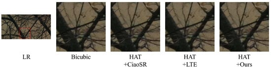 This section applies the real-world dataset to validate a qualitative comparison with other methods. This dataset has real noise images with no GT images. Figure 18, Figure 19 and Figure 20 show the qualitative results of m-DCTformer and other models based on HAT in integer SR, obtained from the real-world dataset for a scale factor of ×2.9. Moreover, Figure 18, Figure 19 and Figure 20 indicate that the m-DCTformer recovers high-frequency DCT components robustly, even in a noisy real-world environment. Therefore, m-DCTformer is suitable for a real-world scenario.