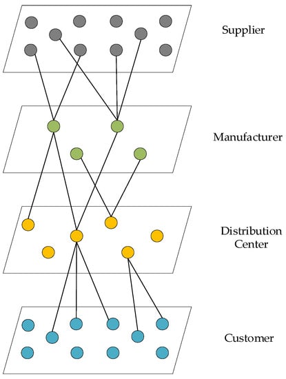 This paper considers a four-tier supply chain network consisting of suppliers, manufacturers, distribution centers, and customers, where the distribution centers are established by the manufacturer based on the region, the number of orders, and the level of transport logistics. Nodes have a hierarchical relationship between the upstream and downstream components of the supply chain. Each layer of nodes can only be connected to its neighboring layer of nodes, and the layers of nodes are independent of each other. The supply chain network structure is shown in Figure 1. Manufacturers produce a variety of products, and each product requires a variety of parts. Different products may require the same parts, and each part is provided by one supplier. The products are first transported by the manufacturer to the distribution centers, each of which has a maximum capacity, and are then transported by the distribution center to the appropriate customers within its coverage area. Each customer’s demand for each product is uncertain.
