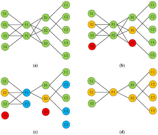 Due to the COVID-19 pandemic, disruptions may occur in any link of the supply chain, and multiple facilities in the supply chain network may fail at the same time or one after another. Considering the ripple effect, after a disruption occurs at a certain point in the supply chain, it can spread upstream or downstream along the supply chain, leading to more large-scale failures. The propagation of disruptions in the supply chain network is shown in Figure 2, where green indicates that a node is functioning normally, yellow indicates that a node is partially disabled, red indicates that a node is completely disabled, and blue indicates that a node is affected. Here, (a) demonstrates a healthy supply chain network and (b) demonstrates disruptions occurring simultaneously at the suppliers and distribution centers, where S2 and D2 partially fail and S4 and D3 completely fail. Additionally, (c) demonstrates the supply chain network after disruption, where the productions of P1 and P2 are affected due to the failure of suppliers S2 and S4. Due to the partial failure of distribution center D2, the demands of customers C2 and C4 cannot be met. The complete failure of D3 results in an inability to handle the C5 demand, and the link between the nodes is disconnected. (d) denotes the supply chain network after considering the propagation of the disruption ripple effect. Due to the supply disruption, the production capacity of product P1 decreases and the production of product P2 is stopped. Customer C1-C4 orders for P1 may be backordered, and orders for P2 must be cancelled. All the orders for customer C5 were cancelled due to the failure of the upstream distribution center.