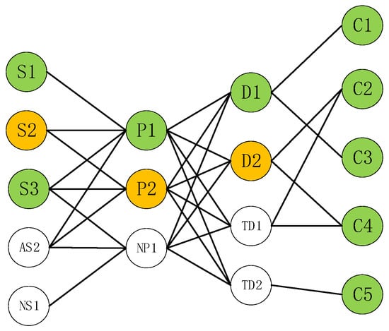 In order to establish a resilient supply chain network, this paper considers a combination of proactive and reactive defense strategies. The manufacturer develops appropriate raw material inventory plans and locates and constructs temporary distribution centers before disruptions occur. The objective is to determine the inventory quantities for each raw material, as well as to find a subset of temporary distribution center locations under conditions that simultaneously satisfy selection preferences, warehouse capacity, and transportation capacity constraints in order to minimize raw material inventory costs and temporary distribution center fixed costs. Considering the uncertainty of the duration of supply disruptions, the manufacturer can make design changes and partially reconfigure suppliers that cannot continue production due to supply shortages, resuming production as soon as possible. After the failure of some distribution centers, the manufacturer selects which distribution centers to open from the constructed temporary distribution centers and reconfigures the distribution network. The reconfigured supply chain network after the adoption of the recovery strategy is shown in Figure 3, where TD1 and TD2 represent the selected temporary distribution centers. When the manufacturer holds a certain amount of raw material inventory and adds AS2 as the substitute supplier for S2, P1 can fully resume production and P2 can resume partial production. In addition, NS1 is the new supplier of the new product NP1 after the design change.