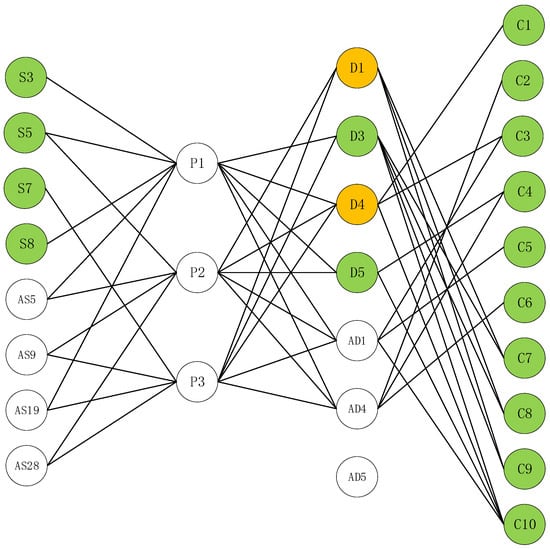 Figure 5 gives the results of the supply chain reconfiguration optimization in the disruption scenario of Case 3. The original suppliers S1, S2, S4, and S6 were disrupted, and the production of products P1, P2, P3 are affected. By incorporating design changes for the disrupted raw materials, AS5, AS9, AS19, and AS28 are selected as new suppliers and a new supply network is established. Considering the manufacturer’s selection preference as well as the handling capacity and construction cost of the temporary distribution center, TD1, TD4, and TD5 are identified as temporary distribution centers. Due to the pandemic, the original distribution centers D1, D2 and D4 failed at the same time. Considering the failure situation and customer demands, the temporary distribution centers TD1 and TD4 are opened. Taking the maximum total profit as the objective, the production, transportation, and distribution plans of the reconstructed supply chain network are determined.