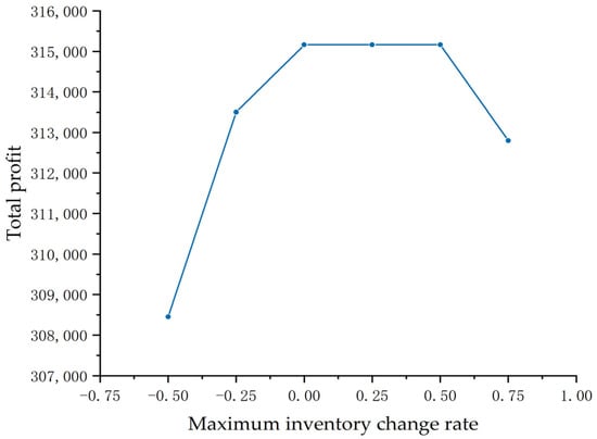 Figure 6 shows the variation in the manufacturer’s expected total profit with the maximum raw material inventory capacity. It can be seen that as the maximum inventory capacity increases, the expected profit also increases. However, when the capacity increases to a certain value, profits no longer change. As the capacity continues to increase, the profit decreases due to redundancy.