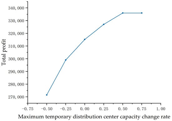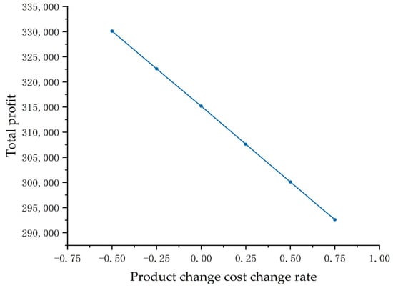 Figure 7 shows the variation in the manufacturer’s total profit with the capacity of the temporary distribution center. When the other parameters are fixed, the expected profit of the manufacturer increases as the capacity of the temporary distribution center increases. The manufacturer’s expected profit is more sensitive to the capacity of the temporary distribution center, and small changes in the parameter values can quickly change the resultant values. When it increases to a certain value, the profit tends to be constant. Therefore, it is necessary to plan the capacity of the temporary distribution center when selecting its location. Figure 8 shows the variation in the manufacturer’s total profit with the cost of product change. It can be seen that the total profit decreases as the product change cost increases.