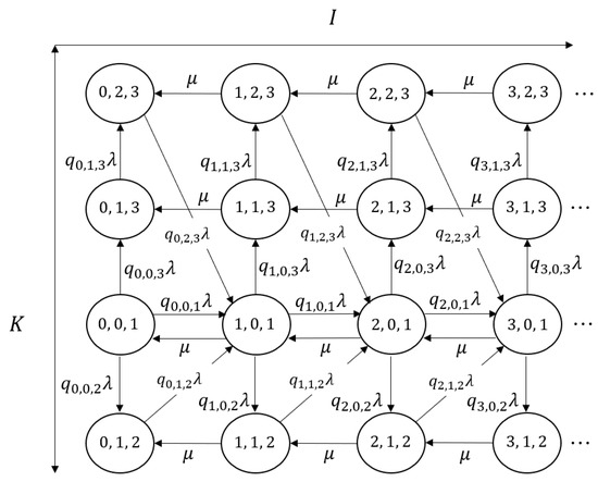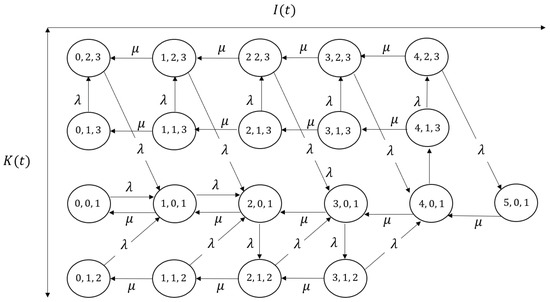 Let , , and denote the number of complete batches, number of waiting customers in the incomplete batch, and the size of the incomplete batch when it becomes full, respectively, at time t. Then, becomes an irreducible three-dimensional Markov chain with state space , where