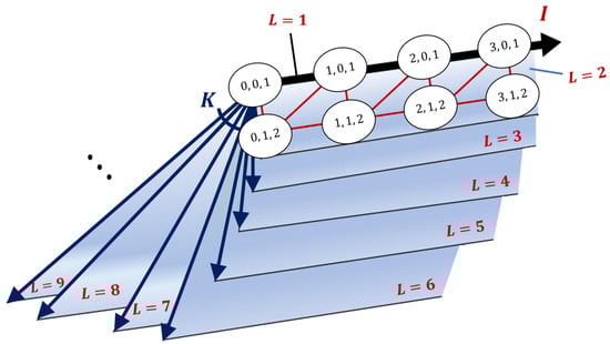 We refer to the transition diagram () in Figure 1 and schematic of the overall transition structure in Figure 2. Let in the diagram denote the probability that a tagged customer who observes i complete batches and 0 customers in the incomplete batch chooses batch size l, similar to that in (2). Notably, Figure 2 shapes ‘book type’ form in which the axis corresponds to the states where any incomplete batch does not exist, and the pages correspond to the other state. In other words, the axis corresponds to the special case of . Based on this three-dimensional Markov chain, we propose algorithmic procedures for analyzing the model in Section 3.